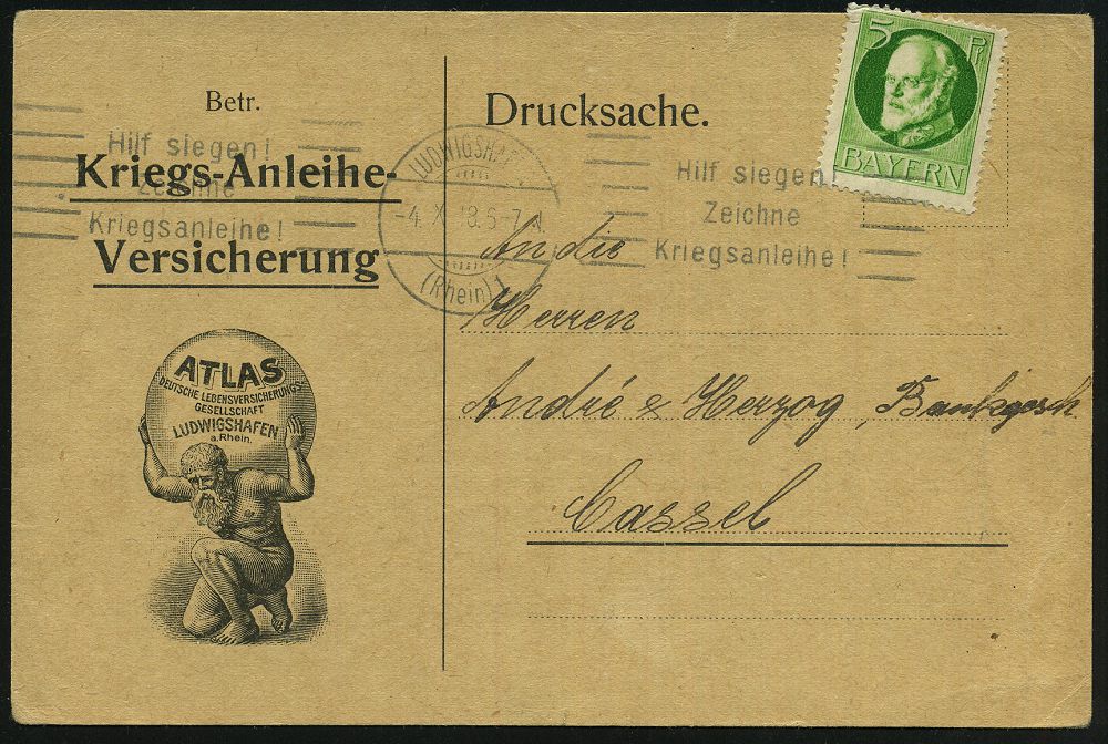 | 364 | 25 € | I. WELTKRIEG 1914 - 18 : LUDWIGSHAFEN/ (RHEIN) 1/ Hilf siegen!/ Zeichne/ Kriegsanleihe! 1918 (4.10.) seltener Band-MWSt auf passender Vordruck-Kt.: Kriegs-Anleihe-Versicherung = Atlas mit Globus , Bedarf, seltene Kombination! (Bo.S 1 , nur 2 Wochen verwendet!) | | |