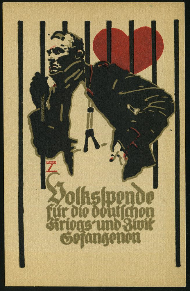 | 410 | 20 € | I. WELTKRIEG 1914 - 18 : DEUTSCHES REICH 1916 Color-Propaganda-Ak: Volksspende für die deutschen Kriegs- u. Zivil-Gefangenen (Gefangener hinter Gittern, Herz) sign. Ludwig Hohlwein (1874 - 1949) stilbildender, bedeutender Illustrator, Reklame- u. Plakat-Graphiker (Uhv. Volksspende 1916, Fritz Malson, München) ungebr. | | |