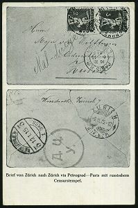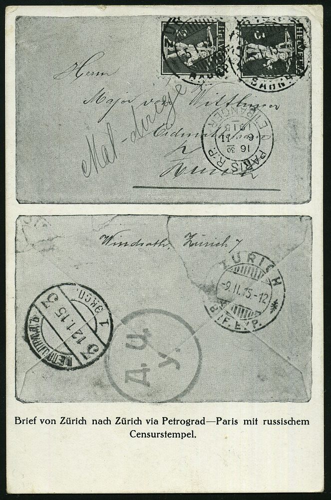 | 504 | 20 € | I. WELTKRIEG 1914 - 18 : SCHWEIZ 1915 (16.5.) SSt: ZÜRICH/BRIEFMARKENAUSSTELLUNG 2x klar a. PP 5 C. Tellknabe: Briefm.-Ausstellung Zürich (rs. Abb.) = Zensurbf. aus Paris n. Petrograd, Ausl.-Kt. ohne Zensur nach Posen! (Pen.S 57) | | |