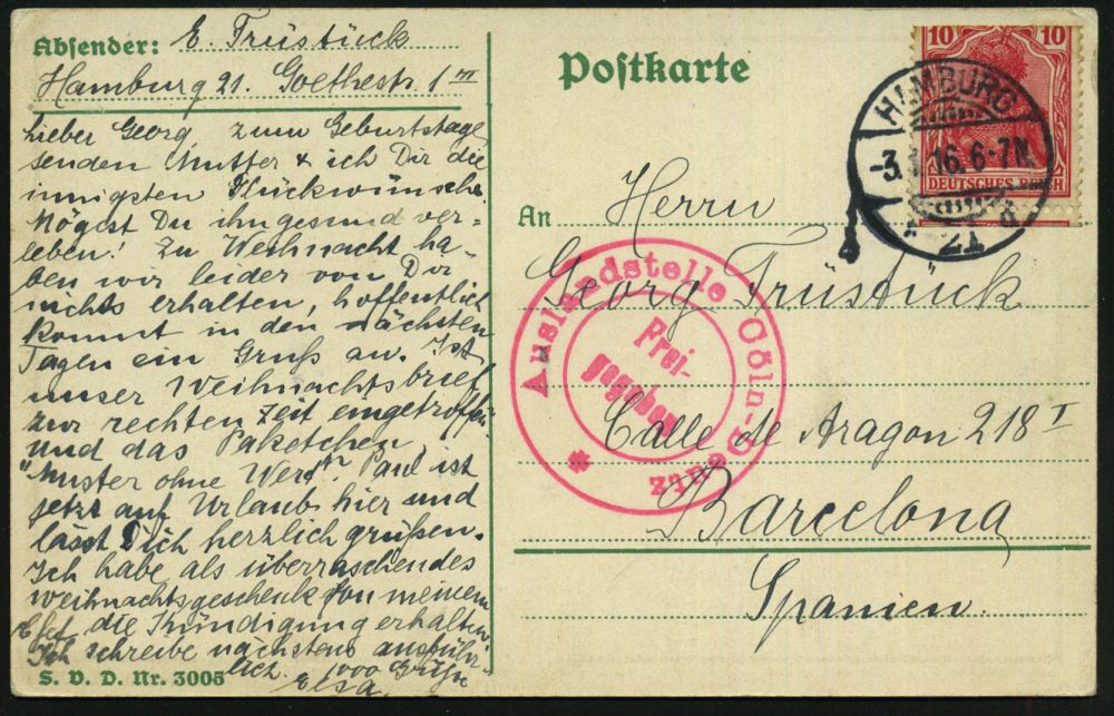 | 356 | 25 € | I. WELTKRIEG 1914 - 18 : HAMBURG/ *21d 1916 (3.1.) 1K-Gitter auf EF 10 Pf. Germania (Schrentrennung) + seltener, roter Zensur-2K: Auslandsstelle Cöln-Deutz/Frei-/gegeben/* (Rie.4, 40 Pkte.) patriotische Color-Kitsch-Ak.: Deutsches Volk, Deutsches Land.., seltene Ausl.-Zensur-Kt. ins neutrale Spanien (Barcelona), Leitweg war Holland, seltene Destination! (Mi.86) | | |