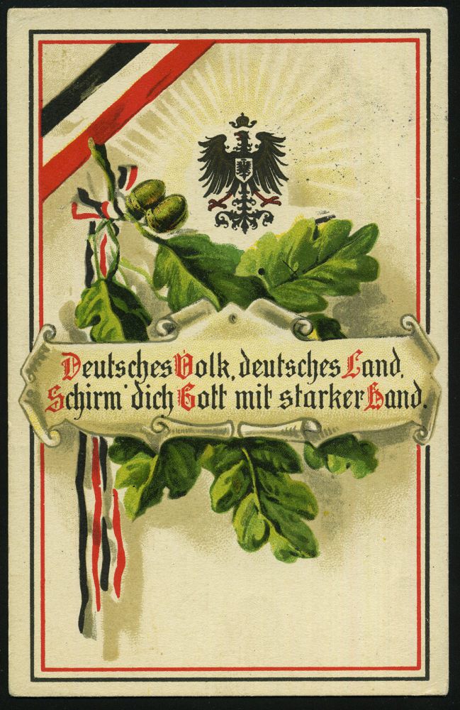 | 404 | 12 € | I. WELTKRIEG 1914 - 18 : DEUTSCHES REICH 1916 (17.3.) Color-Propaganda-Ak.: 1914 Weltkrieg 1916 / Gott schütze unser Vaterland! = Globus in Flammen (Flaggen der Mittelmächte) bayer. 2K-Feldpost (K.B. 6. RES. DIV. (nicht voll, etw. fleckig) Feldpost-Kt. n. Göggingen | | |