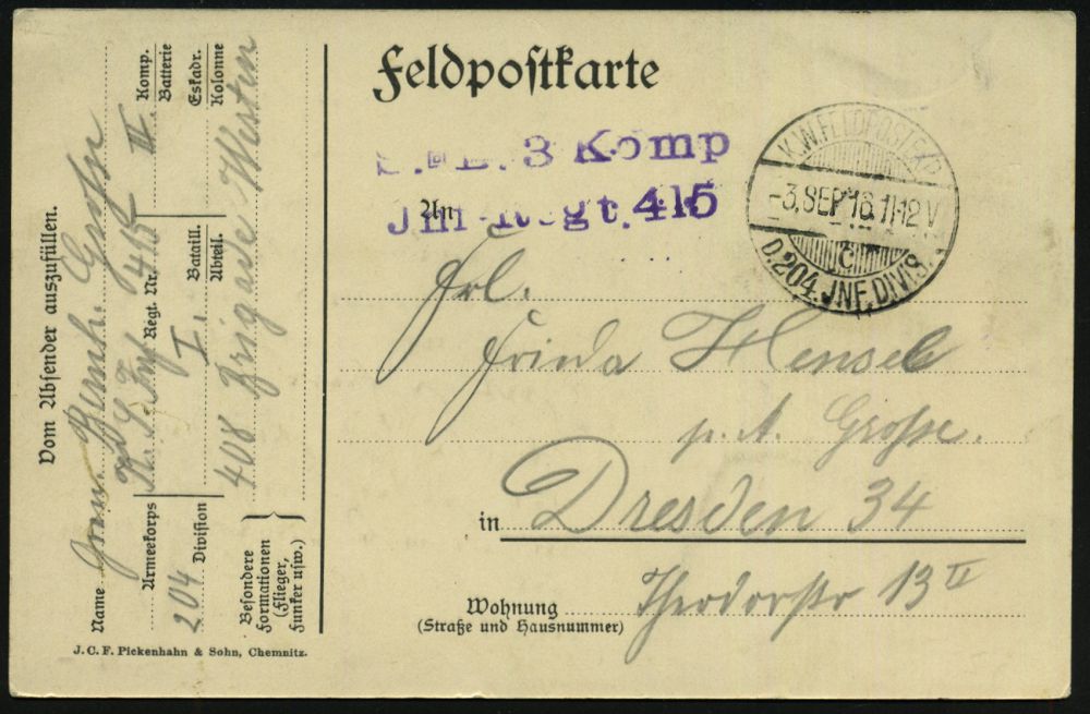 | 415 | 15 € | I. WELTKRIEG 1914 - 18 : DEUTSCHES REICH 1916 (§:):) Color-Künstler-Ak.: "415". (Württembg. Jnf. Rgt.) = Schulterklappe, Lederhelm, Bajonett etc., 1K-Steg: K. W. FELDPOSTEXP./c/D. 204. JNF. DIVIS. (Kat. Nr.907) + 2L: ..Inf.-Regt. 415, Feldpost-Kt. (n. Dresden) | | |