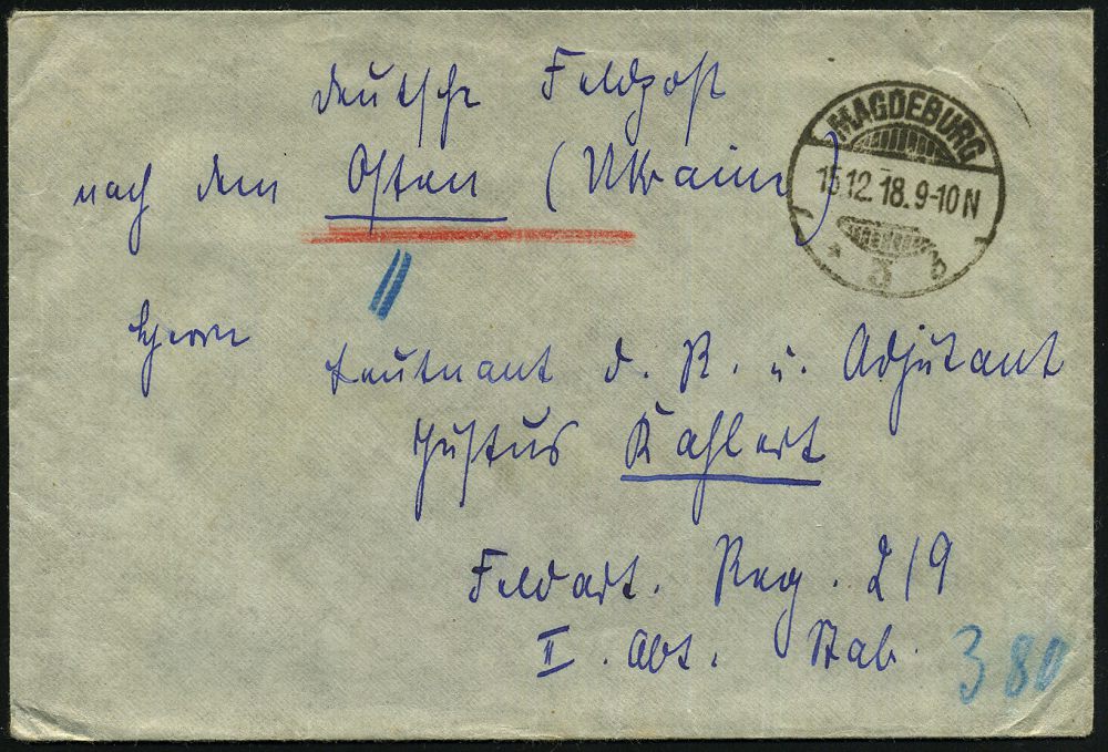 | 366 | 35 € | I. WELTKRIEG 1914 - 18 : MAGDEBURG/ *3b 1918 (11.12.) 1K-Gitter auf Feldpost-Bf. + Inhalt an Feldart. Regt. 219 in der Ukraine! = verzögerte Rückführung des Ost-Heeres! = noch nicht zurückgeführtes Ost-Heer in der Ukraine, da die Alliierten wegen der bolschwisten kein Macht-Vakuum entstehen lassen wollten, seltener Beleg lange n a c h dem Waffenstillstand ! | | |