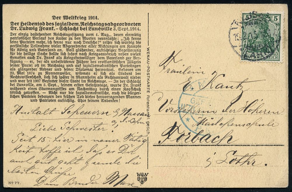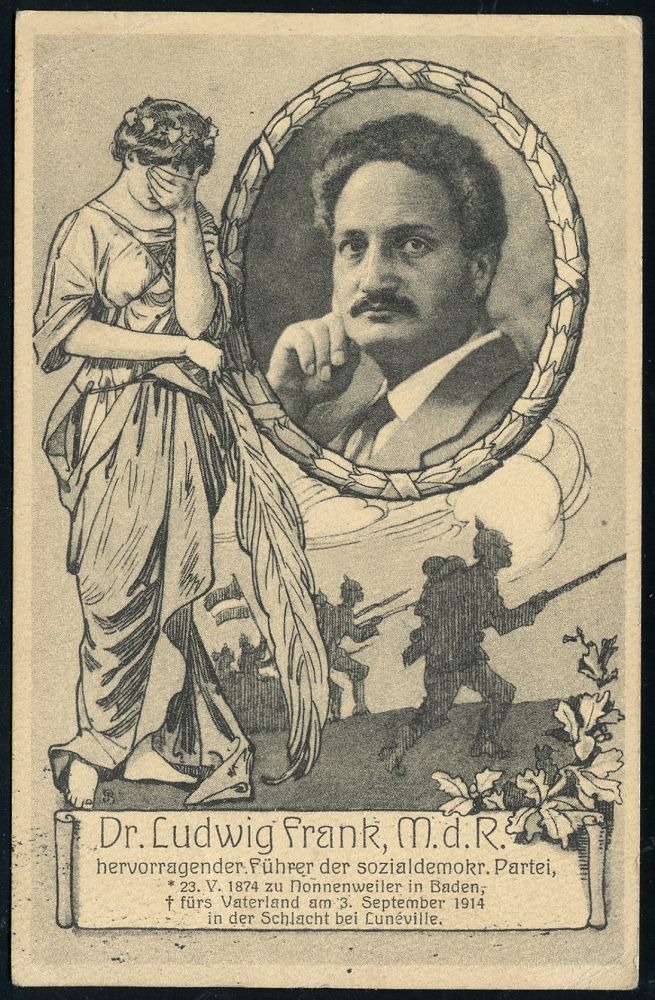 | 367 | 18 € | I. WELTKRIEG 1914 - 18 : MARBURG/ *(LAHN)* 1916 (19.2.) Trauerkarte: Dr. Ludwig Frank M.d.R...(SPD) für das Vaterland am 3. Sept. 1914 in der Schlacht bei Lunéville (Portraitbild, Soldaten u. Trauende) vs. biograph. Text, Bedarf (Mi.85) | | |