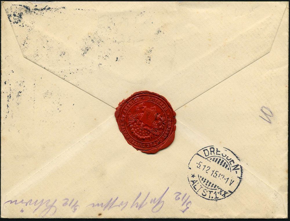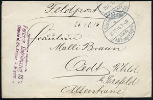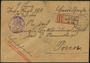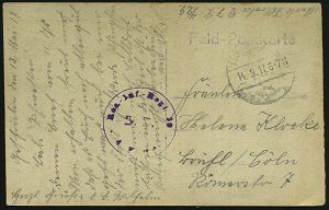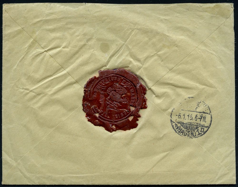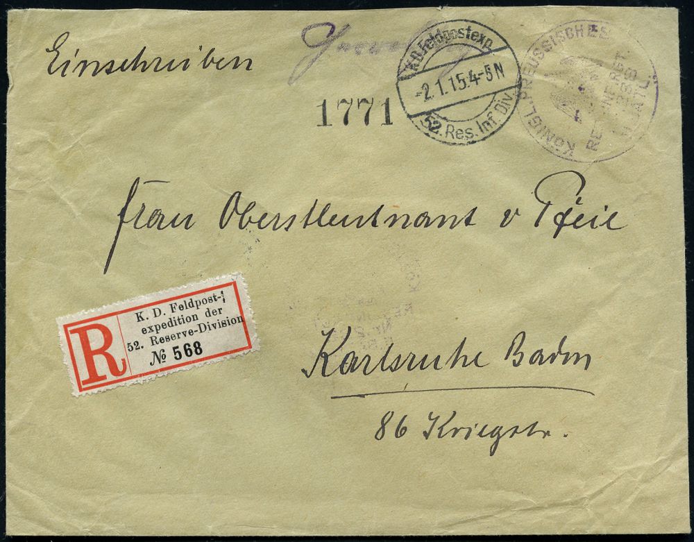 | 391 | 25 € | I. WELTKRIEG 1914 - 18 : DEUTSCHES REICH 1915 (2.1.) 1K-Brücke: K. D. Feldpostexped./52. Res. Inf. Div. + Sonder-RZ: K. D. Feldpost-/expedition der/52. Reserve-Division + viol. Briefstpl., + Paginier-Nr. 1771, rs. rotes Lacksiegel, Feldpost-R-Bf. n. Karlsruhe, rs. AS. | | |