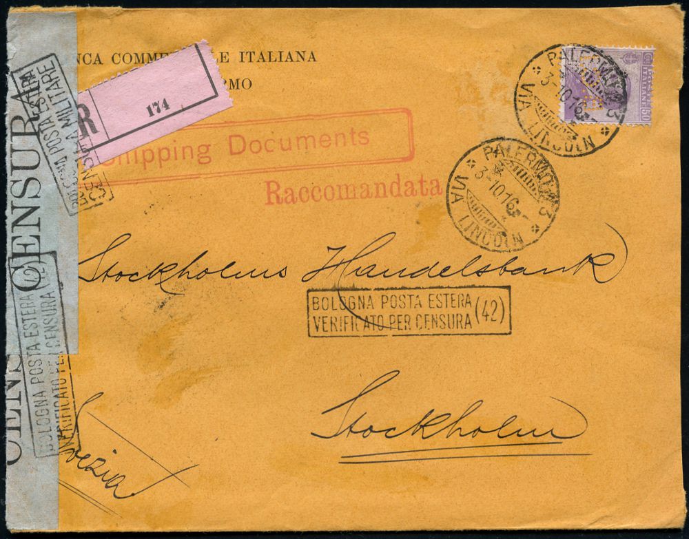 | 486 | 25 € | I. WELTKRIEG 1914 - 18 : ITALIEN 1916 (3.10.) 50 C. Freimarke mit Firmen-Lochung: "B C I" = B(anca) C(ommerciale) I(taliana), 1K-Gitter: PALERMO + stummer R-Zettel + blauer Zensurzettel: VERFICATO/PER/CENSURE + 4x Zensur-Ra.2: BOLOGNA POSTA ESTERA/ VERTICATO PER CENSURA (42) (Wo.2 e, Wo.I) rs. Bank-Siegel-Oblate, Ausl.-Zensur-R-Bf. n. Stockholm (Mi.92 EF, Perfin) | | |
