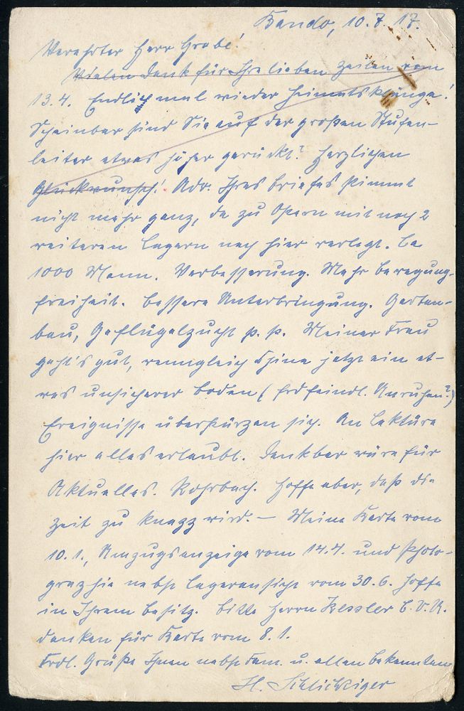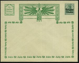 | 451 | 18 € | I. WELTKRIEG 1914 - 18 : DT.BES.BELGIEN 1917 (22.1.) 1K-Gitter: LÜTTICH/*c* auf Germania 5 C./5 Pf. u. 2x 10 C./10 Pf. + blauer Zensur-3K: Auslandsstelle Emmerich/Frei-/gegeben/A * 11 = Riemer unbekannt!, klar gest. Ausl.-Zensur-Bf. n. Leiden, Holland (rs.AS), selten! (Mi.12, 2x 14) | | |