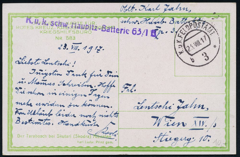 | 495 | 12 € | I. WELTKRIEG 1914 - 18 : ÖSTERREICH 1917 (23.8.) 1K-Segment: K. u. K. FELDPOSTAMT/b 3 * + viol. 1L: K. u. k. schw. Haubitz-Batterie 63/1 B + hs. Abs., Rotkreuz-Spenden-Feldpost-Ak. Nr.583 (Skutari) n. Wien | | |