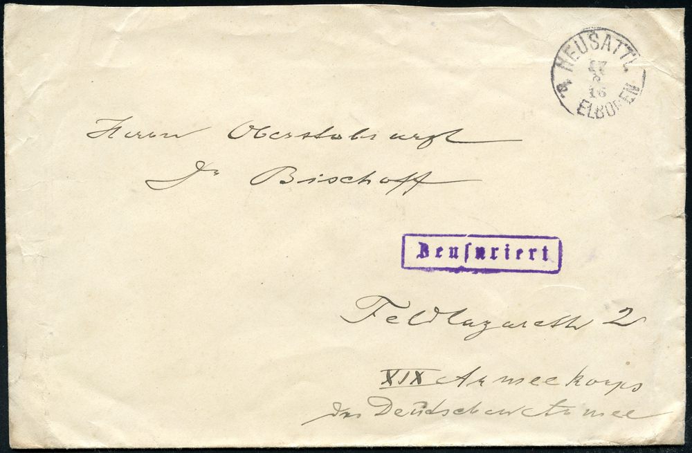 | 499 | 18 € | I. WELTKRIEG 1914 - 18 : ÖSTERREICH 1916 (17.8.) 1K: NEUSATTL/b. ELBOGEN + viol. Zensur-Ra.: Zensuriert (Wo.1) + rs. Zensur-Verschlußzettel: K. u. K. BRIEFZENSURKOMMISSION/ IN KARLSBAD (Wo.9.) Feldpost-Zensur-Bf. an das deutsch A.K. XIX | | |