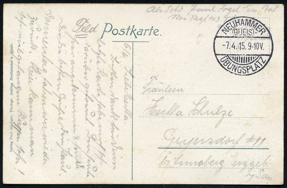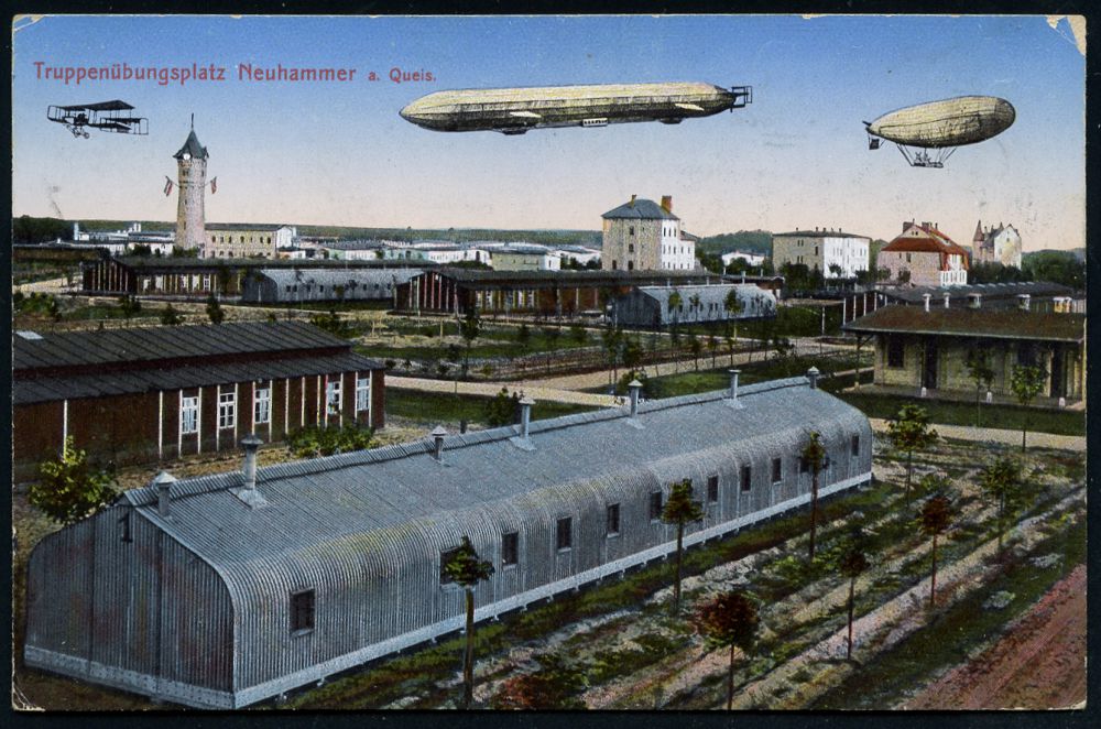 | 372 | 15 € | I. WELTKRIEG 1914 - 18 : NEUHAMMER/ (QUEIS)/ ÜBUNGSPLATZ 1915 (7.4.) 1K-Gitter = Hauspostamt Truppenübungsplatz + hs. Abs.".. Res. Regt. 103" , glasklar gest. Color-Fotomontage-Feldpost-Ak.: Luftschiffe über Truppenübungsplatz n. Geyersdorf | | |