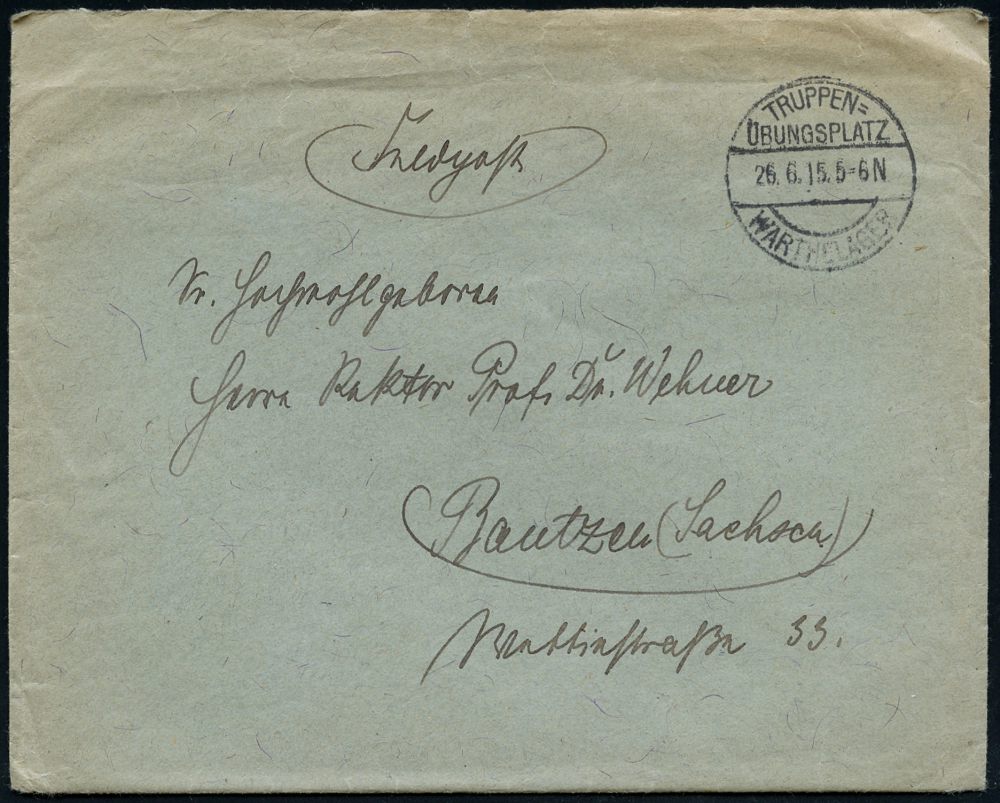 | 380 | 15 € | I. WELTKRIEG 1914 - 18 : WARTHELAGER/ TRUPPEN-/ ÜBUNGSPLATZ 1915 (26.6.) 1K-Brücke + rs. hs. Abs.: ".. Ausb.(ildungs) KursMarthagen b. Posen" , klar gest. Feldpost-Bf. + Inhalt n. Bautzen, 2 Belege kompl.! | | |