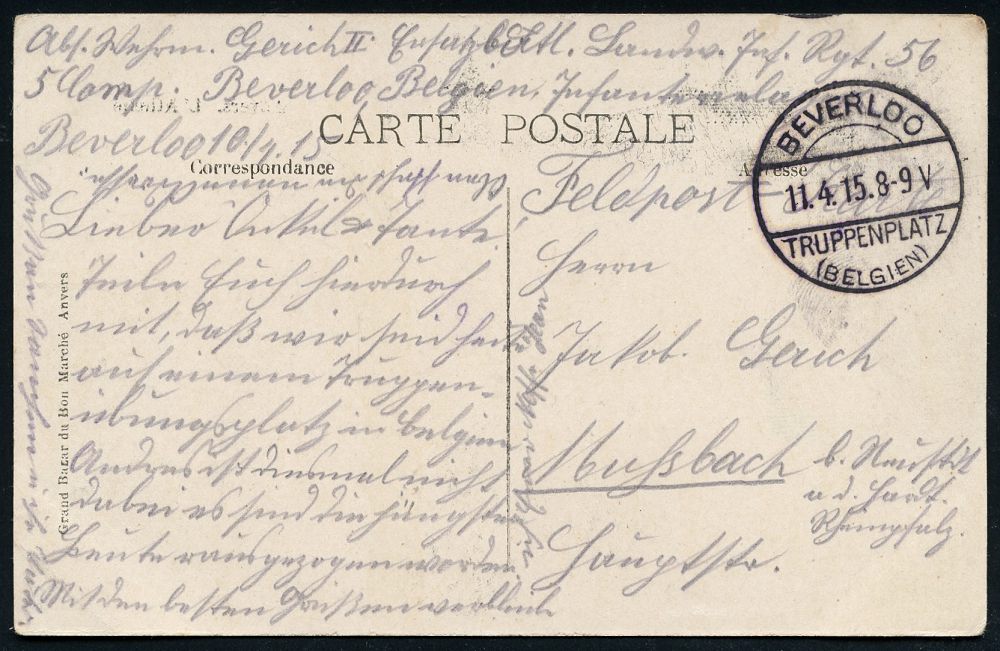 | 447 | 14 € | I. WELTKRIEG 1914 - 18 : DT.BES.BELGIEN 1915 (11.4.) 1K-Brücke: BEVERLOO/TRUPPENPLATZ/(BELGIEN) + hs. Abs.: "..Landw.(ehr) Inf. Rgt. 56.." , glasklar gest. Feldpost-Ak.: Anvers (L´Athène) n. Mußbach | | |