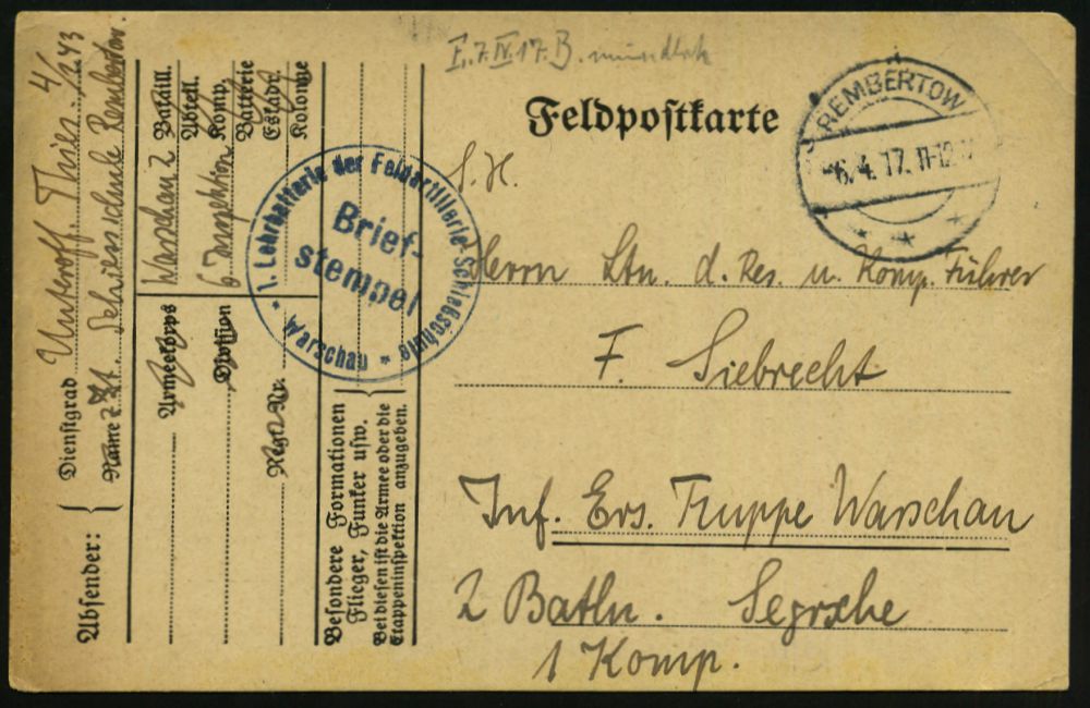 | 462 | 15 € | I. WELTKRIEG 1914 - 18 : DT.BES.RUSS.-POLEN 1917 (6.4.) 1K-Brücke: REMBERTOW/*** + blauer 1K-HdN: 1. Lehrbatterie der Feldartillerie-Schießschule/ Warschau = Rembertow + hs. Abs.: ".. z. Zt. Schiessschule Rembertow..", klar gest. Feldpost-Kt. (n. Warschau) | | |
