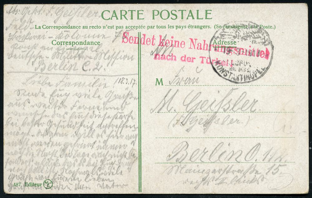 | 466 | 20 € | I. WELTKRIEG 1914 - 18 : DT.MIL.-MISSION TÜRKEI 1917 (19.3.) zweisprachiger 1K: KONSTANTINOPEL + roter 2L: Sendet keine Nahrungsmittel/ nach der Türkei + hs. Abs.: "..Bäckerei-Kolonne 75, Deutsche Militär Mission Berlin C 2", klar gest. Color-Feldpost-Ak.: Rouméli Hissar n. Berlin | | |
