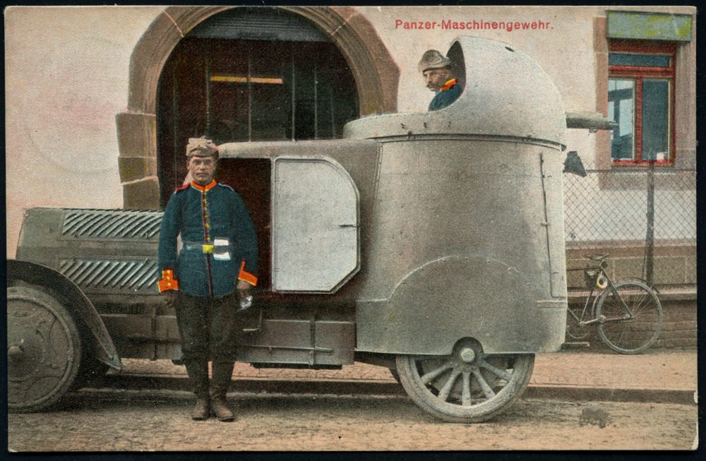 | 351 | 14 € | I. WELTKRIEG 1914 - 18 : FLENSBURG/ *1h 1910 (20.12.) 1K-Gitter auf Color-Foto-Ak.: Panzer-Maschinengewehr = Panzerwagen mit MG-Kuppel , Bedarf (Uhv.: Dessin 92) | | |