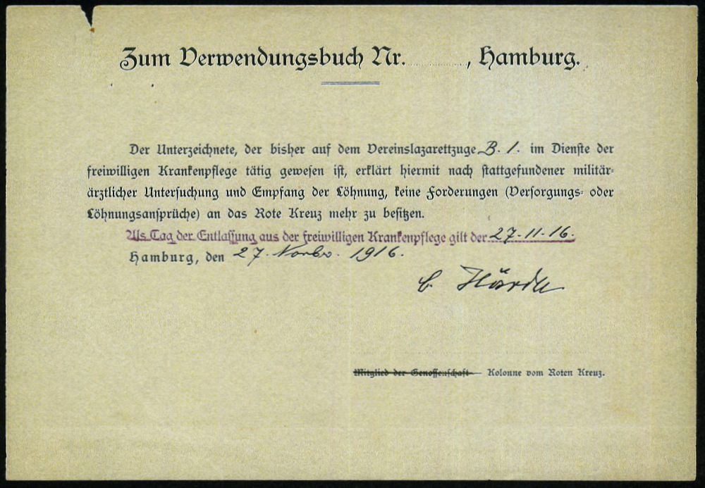 | 357 | 25 € | I. WELTKRIEG 1914 - 18 : Hamburg 1916 (Nov.) 2 verschiedene Rotkreuz-Entlassungs-Dokumente (1x Kerbe) 1x roter 2L: Hamburger Kolonne vom Roten Kreuz.. (je Orts-Vordruck Hamburg) 2 Belege | | |