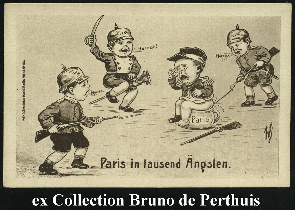 | 382 | 15 € | I. WELTKRIEG 1914 - 18 : DEUTSCHES REICH 1914 monochrome Propaganda-Künstler-Ak.: Paris in tausend Ängsten = 3 deutsche Kinder-Soldaten, französ. Kind auf Topf "Paris" weinend, sign. W S (= Wilh. Schröder.. Berlin NO. 43) ungebr. | | |