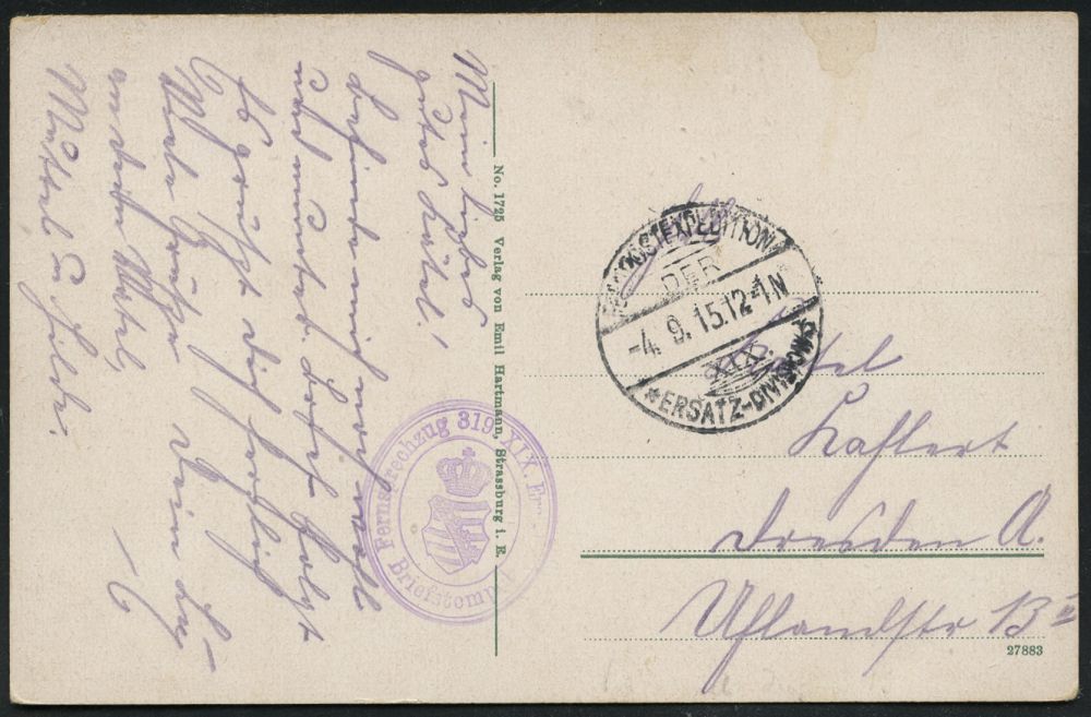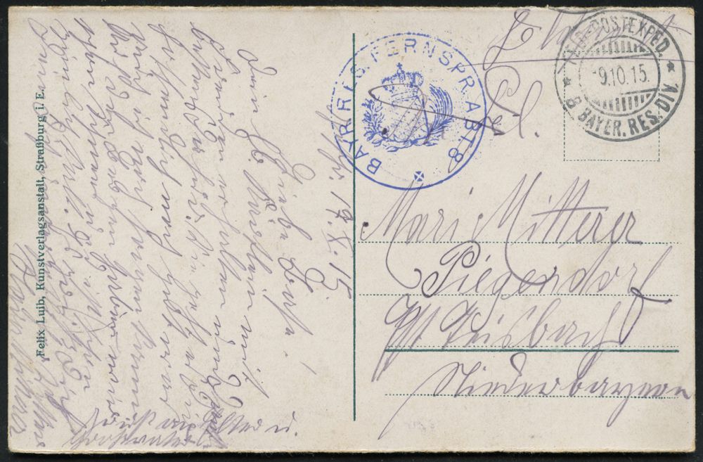 | 398 | 12 € | I. WELTKRIEG 1914 - 18 : DEUTSCHES REICH 1915 (9.10.) 1K-Gitter: FELD-POSTEXPED./**/8. BAYER. RES. DIV. + blauer 1K-HdN: BAYR. FERNSPR.ECH) ABT. 8 + hs. Abs.: "..182. Jnf. Brigade..", s/w.-Foto-Feldpost-Ak.: Rimbach mit Sudelkopf (Vogesen) n. Kiel (Kat.Nr.2692) | | |