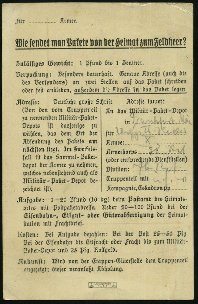 | 400 | 15 € | I. WELTKRIEG 1914 - 18 : DEUTSCHES REICH 1915 (13.12.) Feldpost-Vordruck-Kt.: Wie sendet man Pakete von der Heimat zum Feldheer?.. , 1K-Brücke: K. D. Feldpostexp./a/76. Reserve-Div. (Nr.1297) etc., Feldpost-Kt. (Ostfront) n. Eisleben | | |