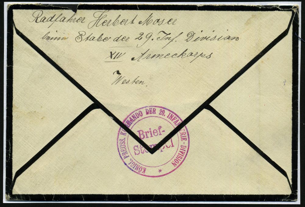 | 402 | 20 € | I. WELTKRIEG 1914 - 18 : DEUTSCHES REICH 1916 (8.3.) 1K-Brücke: K. D. Fedlpostexp./c/29. Inf. Div. (Nr.631) + 2x viol. HdN: KGL. PREUSS. KOMMANDO DER 20. INFANTERIE DIV. (vs. teils undeutl.) rs. klar! + s c h w a r z e s Trauer-Feldpost-Label!, kleiner Feldpost-Trauer-Bf. an S.M.S." Ziethen" (Wilhelmshaven), ungewöhnlicher Beleg! | | |