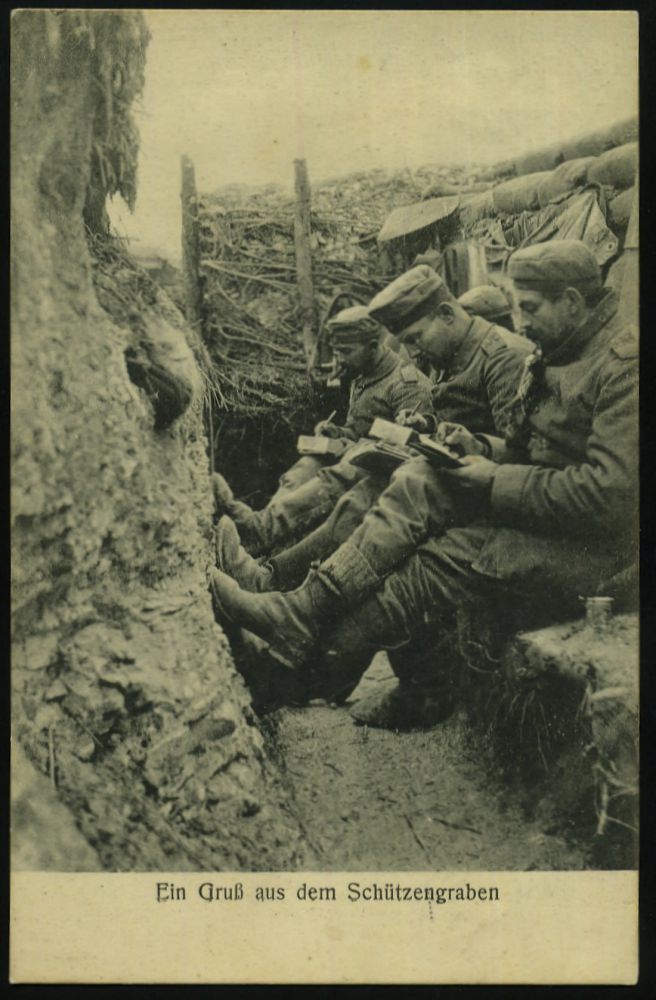 | 405 | 12 € | I. WELTKRIEG 1914 - 18 : DEUTSCHES REICH 1916 (2.4.) s/w.-Foto-Ak.: Ein Gruß aus dem Schützengraben = Briefe schreibende Soldaten (anschriftenseitig schwach fleckig) viol. Briefstempel: Landw.-Brig.-Ers.-Bat. Nr.37 (Eisernes Kreuz) Feldpost-Kt. n. Goslar | | |