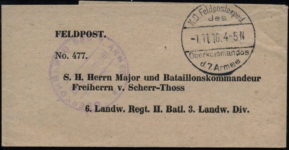 | 418 | 16 € | I. WELTKRIEG 1914 - 18 : DEUTSCHES REICH 1916 (23.7.) 1K-Brücke: K.D. Feldpostexped./des/Oberkommandos/d. 7.Armee (Kat. Nr.79) + viol. 1K-HdN: OBER-KOMMANDO DER 7. ARMEE/*, kleines Feldpost-Zeitungs-Streifband: FELDPOST/ No.463..6. Landw. Regt. II. Batl. 3. Landw. Div | | |