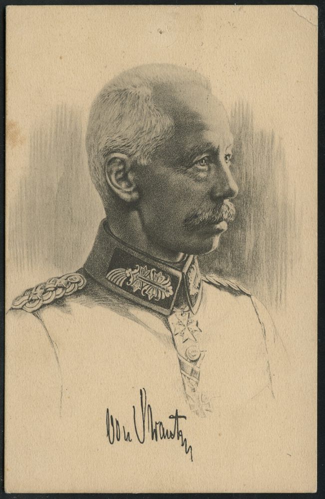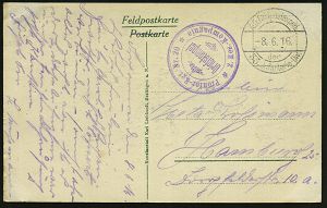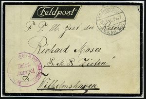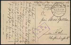 | 424 | 12 € | I. WELTKRIEG 1914 - 18 : DEUTSCHES REICH 1916 (15.2.) s/w.-Künstler-Ak.: von Strantz + viol. Ra.2: S.B./ O. A. A. K. + hs. Abs. , aptierte 1K-Brücke: K. D. Feldpost/ * * = Tarnstpl., klar gest. Feldpost-Kt. n. Kiel (Uhv.: Stengel & Co. Dresden 49231) | | |