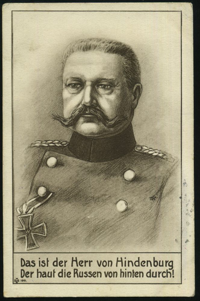 | 438 | 12 € | I. WELTKRIEG 1914 - 18 : DEUTSCHES REICH 1917 (12.11.) s/w.-Künstler-Propaganda-Ak.: Das ist der Herr von Hindenburg/Der haut die Russen hinten durch! (Brustbild, kl. Fleckchen) + viol. 2K-HdN. (Fuß Artl.-Rgt. 1) 1K-Brücke: KÖNIGSBERG/* (PR.) 5/o, klar gest. Feldpost-Kt. n. Beuthen/OS | | |