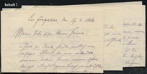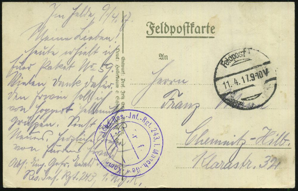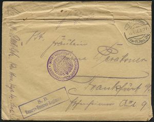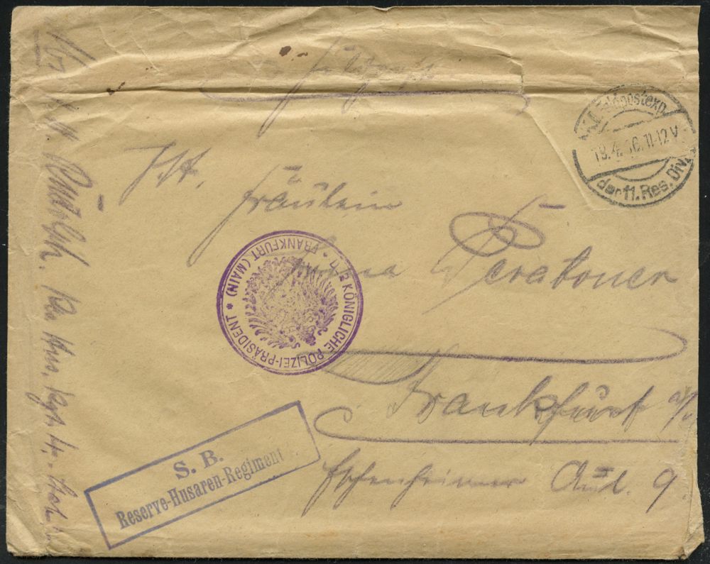 | 406 | 18 € | I. WELTKRIEG 1914 - 18 : DEUTSCHES REICH 1916 (18.4.) 1K-Brücke: K. D. Feldpostexp./der 11. Res. Div. + blauer Ra.2: S. B./ Reserve-Husaren-Regiment 4 (Nr. undeutl.) + viol. 2K-Ank.Stpl.: DER KÖNIGLICHE POLIZEI-PRÄSIDENT/ FRANKFURT (MAIN), sauber gest. Feldpost-Bf. (oben etw.faltig, rechts kl. Öffnungsmäng.) mit Inhalt: 12 Seiten! an ´Meine liebe, süße, kleine Frau!..´ im Polizei-Präs. Ffm, 4 Belege kompl.! (aus "Les Forgettes", Frankr.) | | |