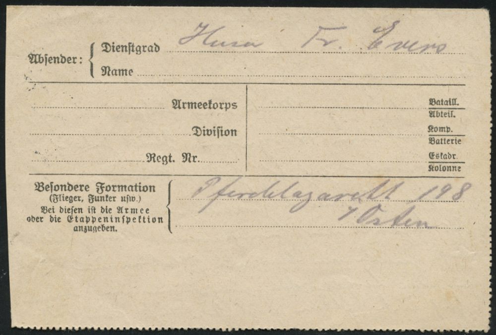 | 414 | 12 € | I. WELTKRIEG 1914 - 18 : DEUTSCHES REICH 1916 (15.8.) 1K-Brücke: K. D. Feldpostexped./b/d. 4. Kavallerie-Div. + viol. 3K-HdN: Pferdelazarett 198, klar gest. , kleiner Feldpost-Falt-Bf. (schwache Fleckchen) mit Inhalt n. Neumünster | | |
