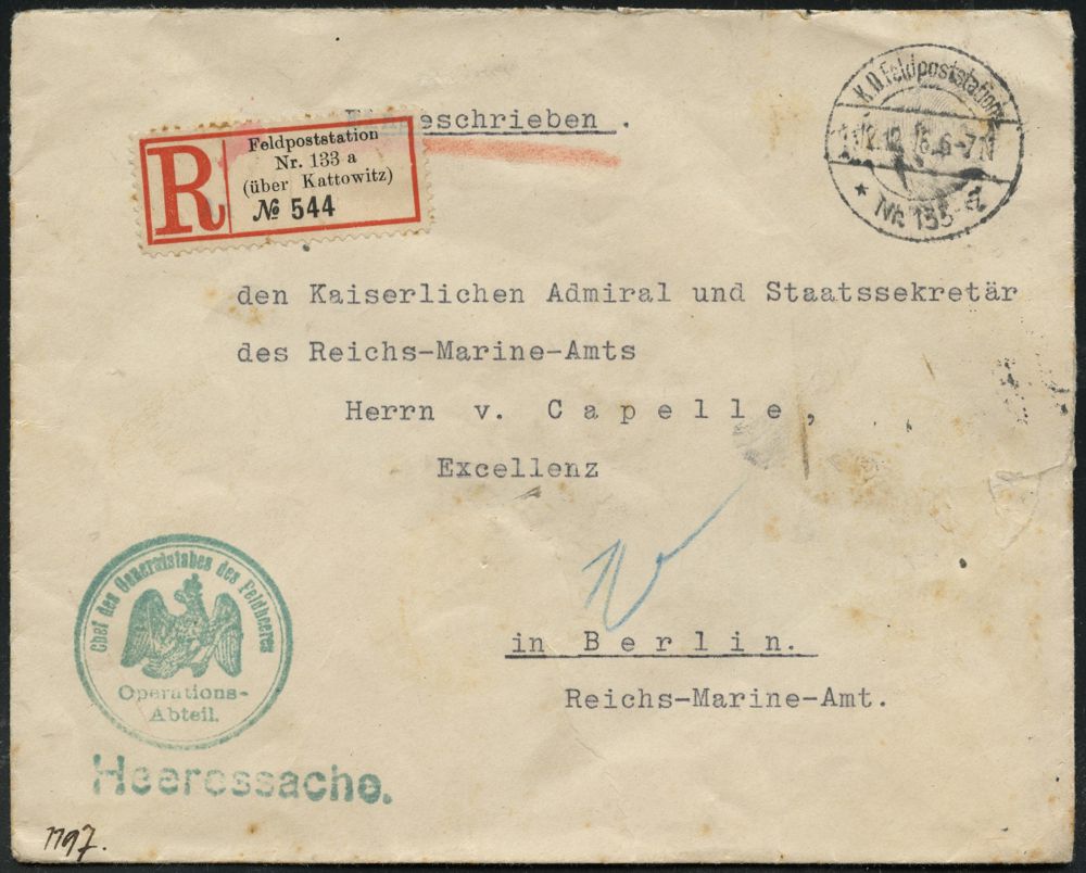 | 420 | 50 € | I. WELTKRIEG 1914 - 18 : DEUTSCHES REICH 1916 (12.12.) 1K-Brücke: K. D. Feldpoststation/* Nr.133 a + gez. Sonder-RZ: Feldpoststation/ Nr. 133/ (über Kattowitz) + grüner HdN: Chef des Generalstabes des Feldheeres/ Operations-/Abteil. + rs. maschinengeschr. Abs.: Generalfeldmarschall v. Hindenburg.. Gr. H. Q. (Siegel entfernt, kl. Riß geschl.) seltener Fern- Dienst-R-Bf. an Adm. u. Staatssekretär v. Capelle (n. Berlin) | | |