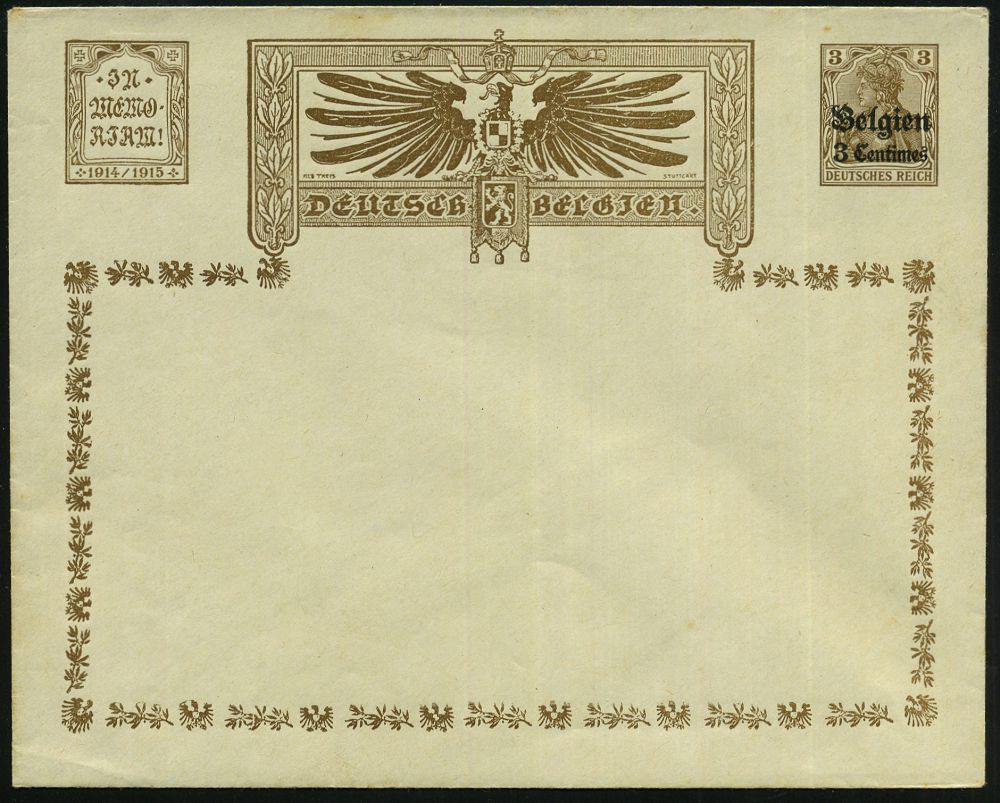 | 448 | 30 € | I. WELTKRIEG 1914 - 18 : DT BES. BELGIEN 1914 PU 3C./3 Pf.,5C./5 Pf.,10C./10 Pf. Germania "JN MEMORIAM ! 1914-1915" (Reichsadler) ungebr., 3 Belege (ME.PU1-34/D) | | |