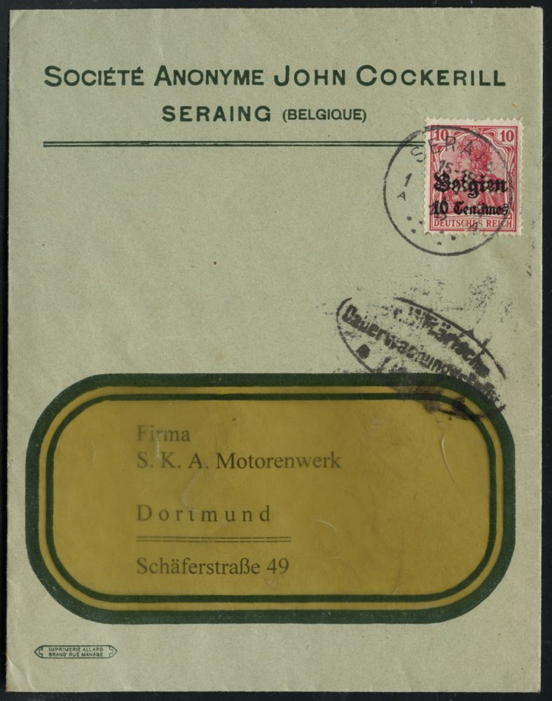 | 453 | 20 € | I. WELTKRIEG 1914 - 18 : DT. BES. BELGIEN 1917 10 C./10 Pf. Germania mit Firmenlochung: J C = SA J(OHN) C(OCKERILL) = Walzwerk u. Rüstungsbetrieb (gegr. von Briten J. Cockerill 1790 - 1840) + schw. Zensur-Oval: Milit. Überwachungsstelle Lüttich, sauber gest. Zensur-Firmen-Bf.: SA JOHN COCKERILL, SERAIN.. (Mi.3) | | |