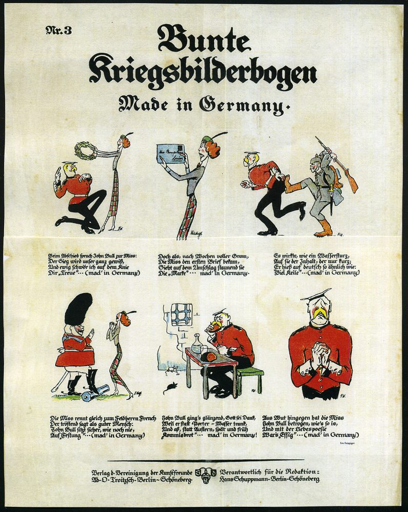 | 484 | 50 € | I. WELTKRIEG 1914 - 18 : GROSSBRITANNIEN / DEUTSCHES REICH 1914 anti-britisches Color-Propaganda-Plakat in Comic-Manier: Bunte Kriegsbilderbogen Nr. 3 "Made in Germany", 6 anti-brtiische Darstellungen, signiert Fritz Wolff und Verse, sign. Leo Leipziger (gefaltet, 2x kl. Randriß) John Bull vom Sieger bis zum Kriegsgefangenen, Verlag d. Vereinigung der Kunstfreunde Ad. O. Troitzsch, Bln-Schöneberg, selten! (Format ca, 35 x 45 cm = ca. A2) | | |