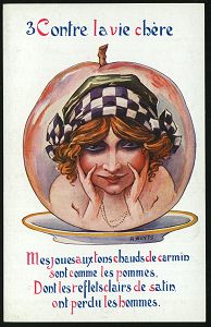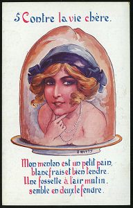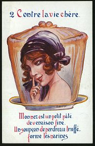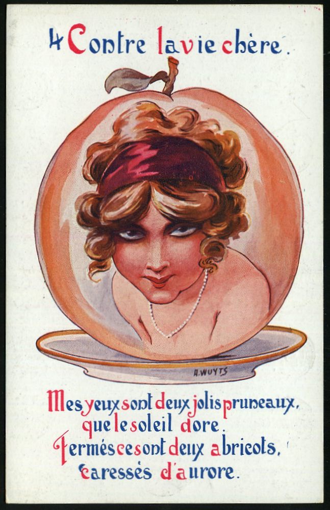 | 470 | 70 € | I. WELTKRIEG 1914 - 18 : FRANKREICH 1914 & verschiedene Color-Künstler-A.: Contre la vie chère No. 1 bis 6 = elegante Frauenköpfe auf Tellern als "Delikatessen", alle sign. A. Wuyts , kompl. Serie (Uhv. A COYER, "WELCOME SURCHOIX" = Schuhcrme, Schuhabsätze etc.) alle ungebr., 6 Belege (ex Collection Bruno de Perthuis) | | |