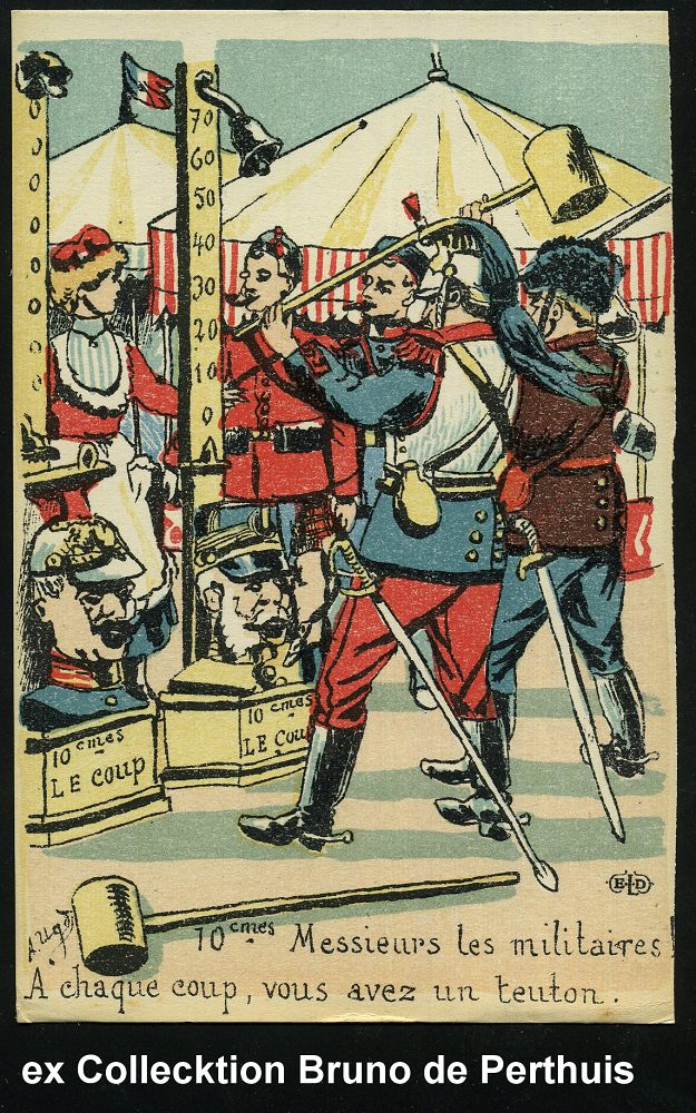 | 472 | 15 € | I. WELTKRIEG 1914 - 18 : FRANKREICH 1914 Color-Propaganda-Künstler-Ak.: Auf dem Jahrmarkt, jeder Schlag ein Deutscher = "Hau den Lukas" mit Köpfen Wilhelm II. und Franz Joseph, sign. Uhd (Uhv. ELD = Edition Le DELEY, Paris) rs. Text, ungebr., selten! | | |