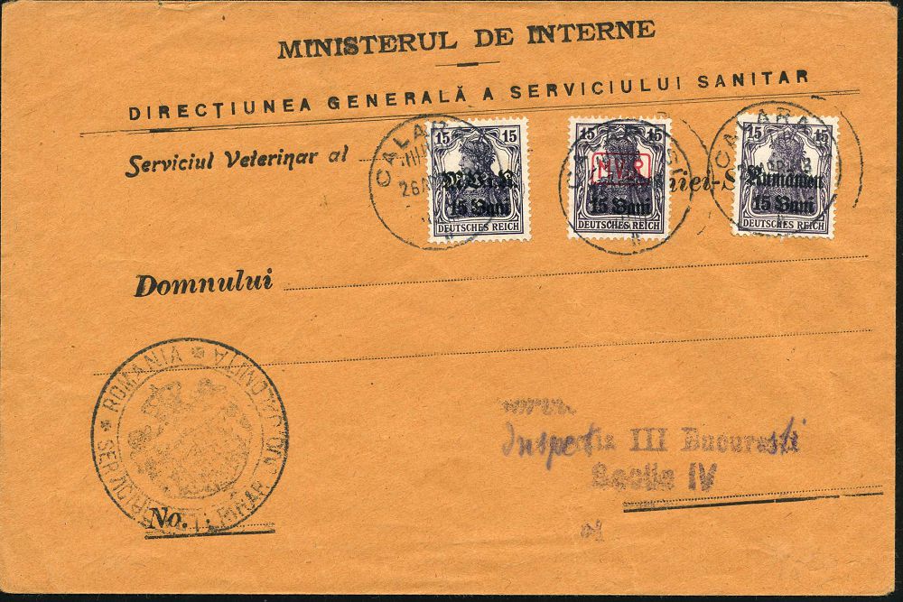 | 463 | 20 € | I. WELTKRIEG 1914 - 18 : DT.BES.RUMÄNIEN 1918 (26.4.) 15 Pf. Germania, 3 verschied. Aufdrucke, 3 x 1K: CALARASI + schw. 2K-HdN: SERVICIU VETERINAL.. , Dienst-Bf.: MINISTERUL DE INTERNE.. Serviciul Veterinar (Innen-Ministerium, Veterinär-Dienst) n. Bukarest (Mi.1, 5, 10) | | |