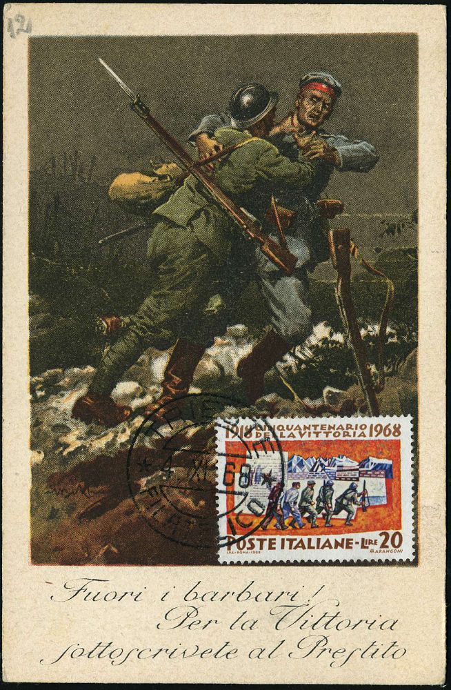| 489 | 12 € | I. WELTKRIEG 1914 - 18 : ITALIEN 1968 (4.11.) 20 L. "50 Jahre Sieg 1918" (Mobilmachung) auf alter Color-Propaganda-Künstler-Ak.: "Kriegsanleihe" (Italiener erwürgt deutschen Soldaten) Künstler-Signatur (Mi.1283) | | |