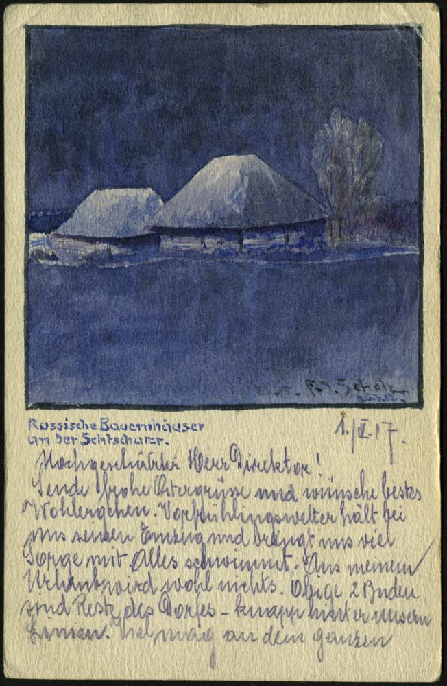 | 426 | 18 € | I. WELTKRIEG 1914 - 18 : DEUTSCHES REICH 1917 (3.4.) aptierte 1K-Brücke: K. D. Feldpost/b auf Feldpost-Label (rot) + viol. Ra.3: ...Landw. Inf. Regt. 51 auf h a n d g e m a l t e r Feldpost-Ak.: Aquarell "Russische Bauernhäuser an der Schtscharer" n. Böhmen | | |