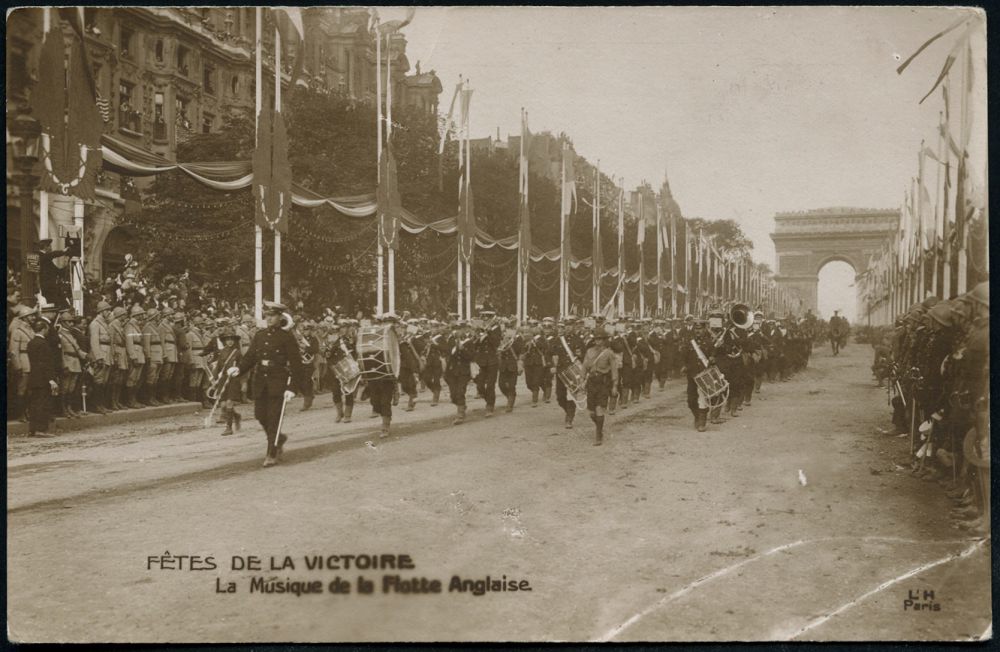 | 483 | 12 € | I. WELTKRIEG 1914 - 18 : FRANKREICH 1918 monochrome Foto-Ak: Fêtes de la Victoire = Siegesparade Paris (am Arc de Triomphe, brit. Marine-Musikkorps, Scouts) ungebr. | | |