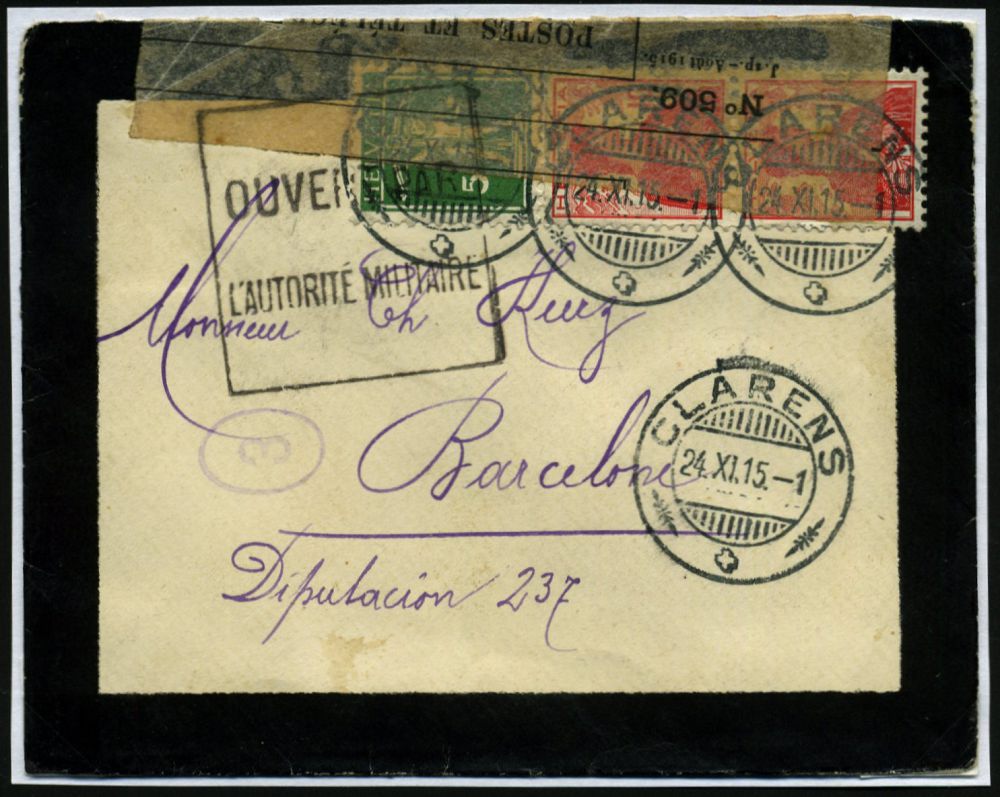 | 506 | 22 € | I. WELTKRIEG 1914 - 18 : SCHWEIZ 1915 (24.11.) 2K-Gitter: CLARENS + schw. , französ. Zensur-Ra.: OVERT PAR/L´AUTORITÉ MILITAIRE (Wo.4 b) + Zensurstreifen: No. 509/..Août/ POSTES ET TELEGRAPHES/ Art.483 de l´Instruction générale.) u.a. rs., dekorativer Ausl.-Transit-Zensur-Trauer-Bf. n. Barcelona (Mi.113, 2x 144) | | |