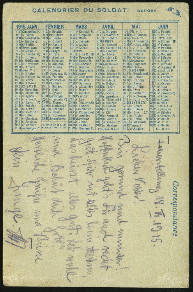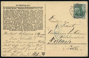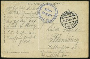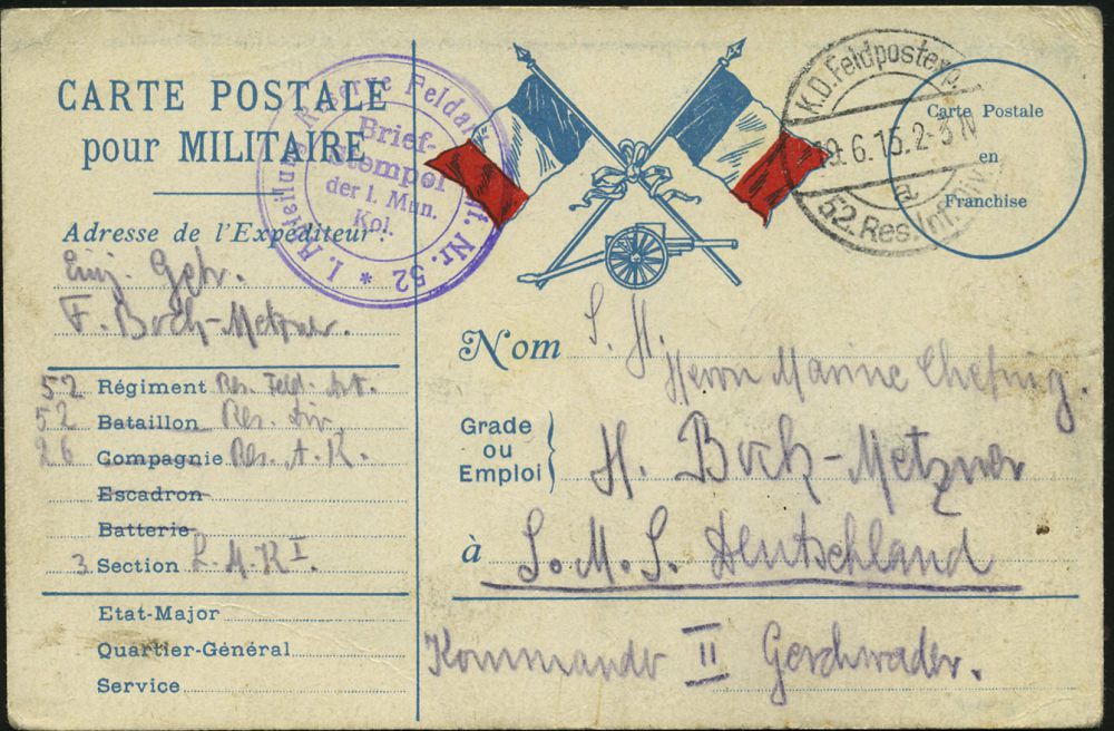 | 395 | 14 € | I. WELTKRIEG 1914 - 18 : DEUTSCHES REICH 1915 (19.6.) 1K-Brücke: K.D. Feldpostexped./a/52. Res. Inf. Div. (Kat.Nr.1276) auf patriot., französ. Beute-Kt. (Flaggen, Geschütz, rs. Kalender für 1915) + viol. 3K-HdN: I. Abt. Res. Feld-Art. Regt. Nr.52, Feldpost-Kt. an Kriegsschiff "S.M.S. Deutschland" | | |