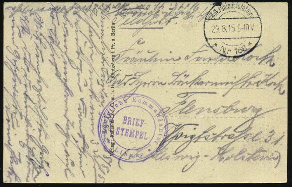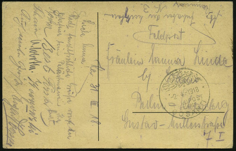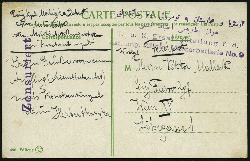 | 501 | 25 € | I. WELTKRIEG 1914 - 18 : ÖSTER.POST TÜRKEI 1916 (ca.) viol., zweisprachiger 4L: k. u. K Ersatzabt. f.d./öst ung. 24cm Mörserbatterie No.9 (arabisch - deutsch) + viol. 1L.: Zensuriert (Wo.1), Feldpost-Zensur-Ak. der österr. Militär-Mission! (Konstantinopel) n. Wien | | |