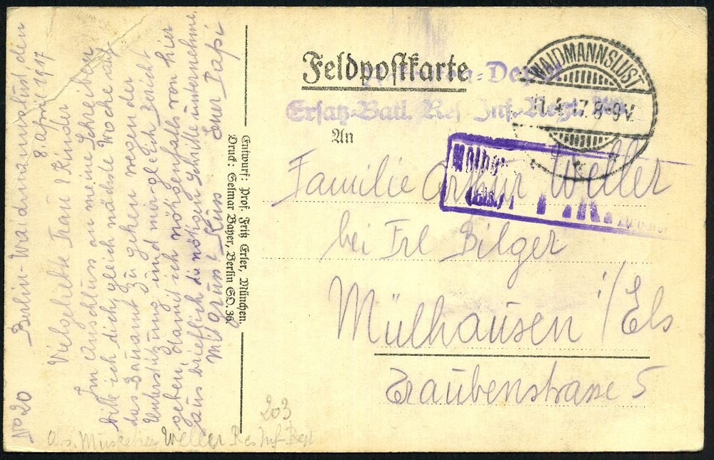 | 344 | 18 € | I. WELTKRIEG 1914 - 18 : Berlin-Waidmannslust 1917 (11.4.) 1K-Gitter: WAIDMANNSLUST/*** + 2L: Jnf.Reg.203 + Zensur-Ra. (Mühlhausen) teils undeutl., Künstler-Propaganda-Ak: Helft uns siegen!, zeichnet Kriegsanleihe (sign. Erler) Soldat mit Gasmaske, Feldpost-Zensur-Ak. (n. Mühlhausen) | | |