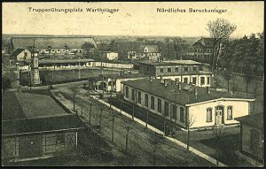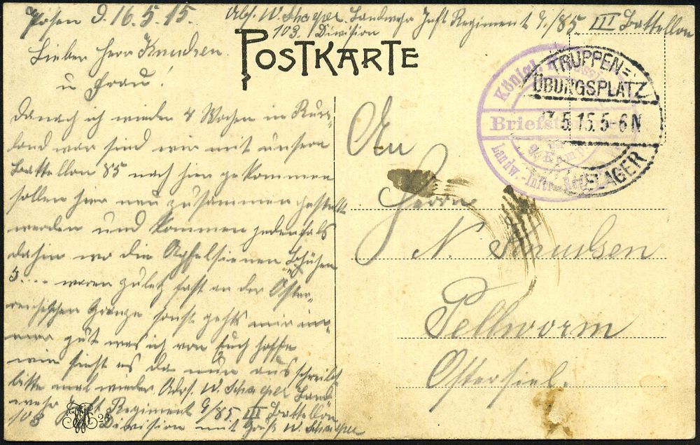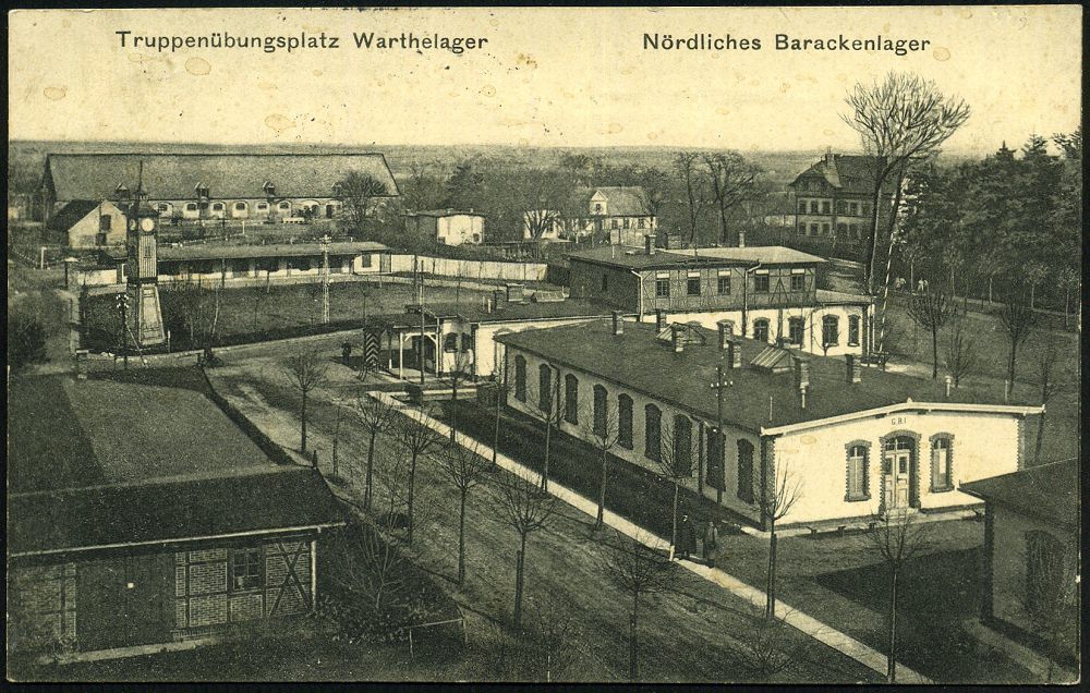 | 379 | 12 € | I. WELTKRIEG 1914 - 18 : WARTHELAGER/ TRUPPEN=/ ÜBUNGSPLATZ 1915 (17.5.) 1K-Brücke = Hauspostamt Truppenübungsplatz + viol. 1K-HdN: Königl. Preussisch. Landw.-Inftr.-Regt. No.85 + hs. Abs. (108. Division) s/w.-Feldpost-Ak. (kl. Fleckchen): Nördliches Barackenlager n. Pllworm | | |