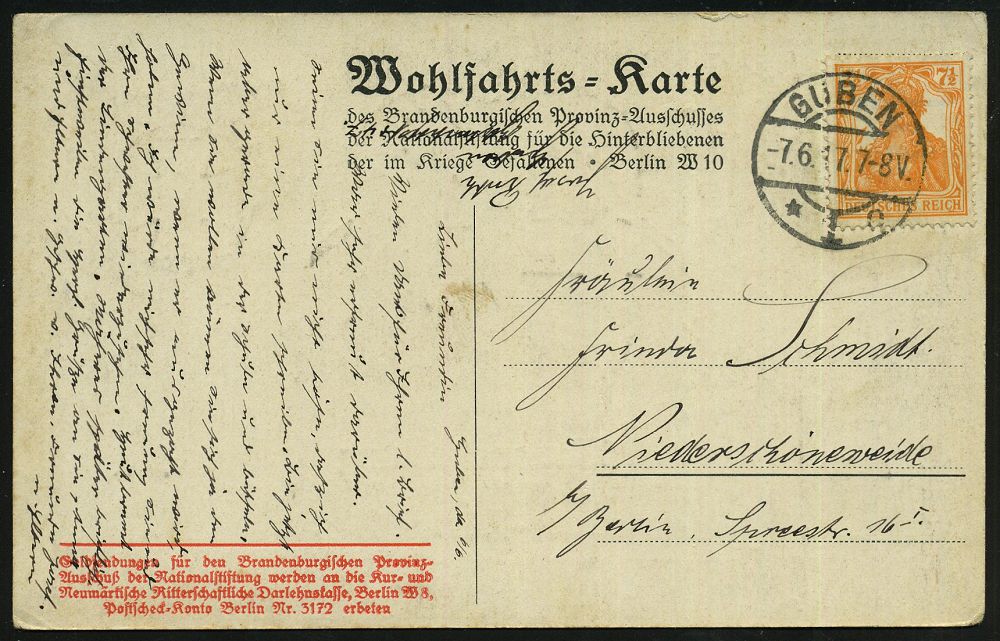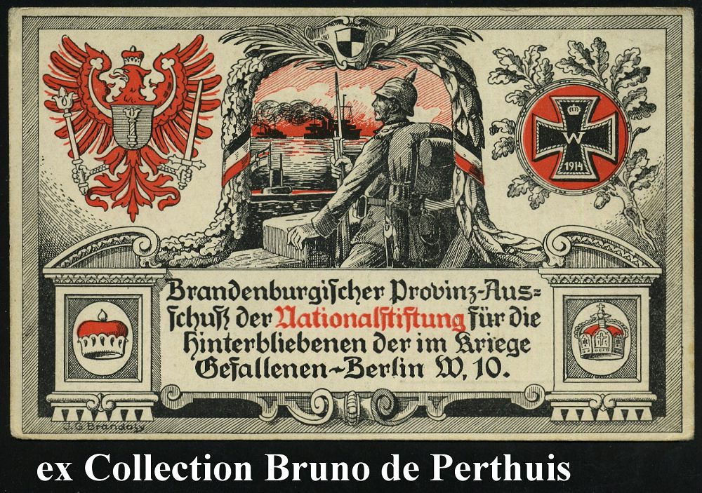 | 355 | 14 € | I. WELTKRIEG 1914 - 18 : GUBEN/ *1o 1917 (7.6.) 1K-Brücke auf zweifarbiger, patriot. Spenden-Ak.: Brandenbg. Nationalstiftung für Hinterbliebene, sign. J. G. Brandoly (Soldat auf Wache, U-Boot, Kriegsschiffe etc.) EF 7 1/2 Pf. Germania (Mi.99 EF) Bedarf | | |