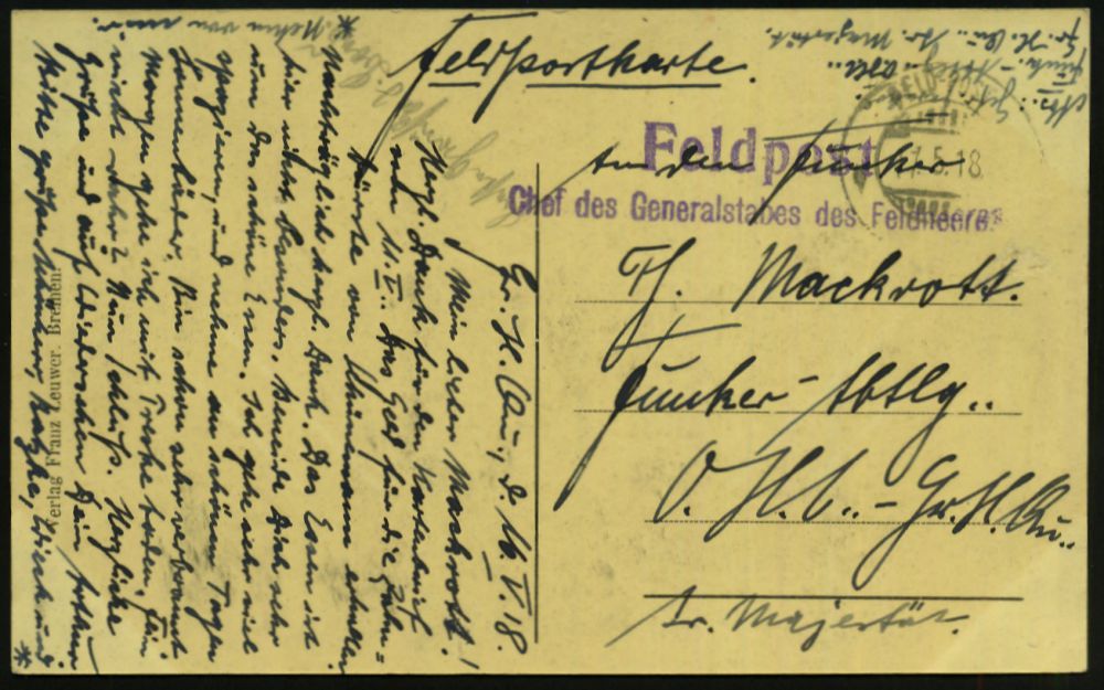 | 442 | 20 € | I. WELTKRIEG 1914 - 18 : DEUTSCHES REICH 1918 (11.5.) bayer. 2K-Gitter: FELD-POST + viol. 2L: Feldpost/ Chef des Genralstabes des Feldheeres + hs. Abs.: ".. Funker-Abtlg....Gr. H. Qu. Sr. Majestät" = Ostfront, s/w.-Foto-Ak. (Ort ?) an Funker-Abtlg. ..Gr. H. Qu. Sr. Majestät (HQ. nach HQ.!), seltener Beleg | | |