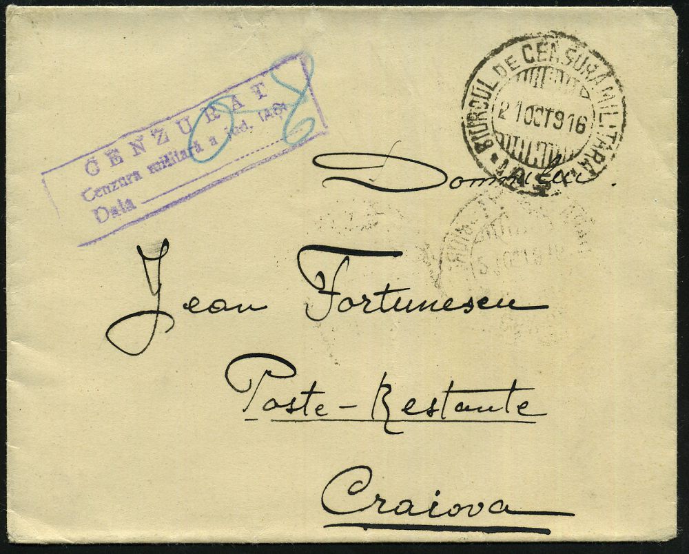 | 502 | 25 € | I. WELTKRIEG 1914 - 18 : RUMÄNIEN 1916 (21.10.) 2K-Gitter: BIURCUL DE CENSURA MILITARA/IASI (Wo.2) + viol. Ra.3: CENSURAT/Cenzura militara a. jud. IASI/Data.. = Wolter unbekannt! (ähnl. Wo.7) rs. Frankatur mit Zensur-2K-Gitter entwertet! (2x Wo.2) seltener Inl.-Zensur-Bf. n. Craiova | | |