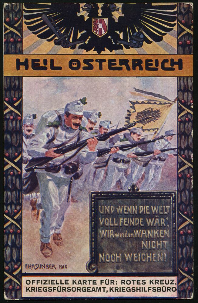 | 498 | 12 € | I. WELTKRIEG 1914 - 18 : ÖSTERREICH 1915 (14.11.) Color-Propaganda-Künstler-Spenden-Ak.: HEIL ÖSTERREICH.. = angreifende Infanterie etc. = Rotkreuz-Spenden-Ak. No.168) sign. E. HASUNGER, gest. WIEN 101, Bedarfs-Inl.-Kt. (ex Collection B. de Perthuis) | | |
