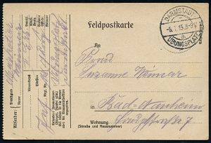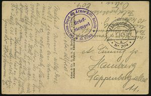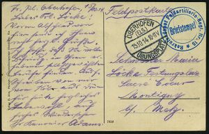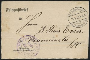 | 409 | 12 € | I. WELTKRIEG 1914 - 18 : DEUTSCHES REICH 1916 (29.5.) 1K-Brücke: Kais. Deutsche/Nr.216/Feldpoststation + viol. 2K-HdN: Evangl. Etappenlazarett-pfarrer/ der 8. Armee + viol. Abs.-3L, nachgesandte Feldpost-Kt. = Verwundeten-Seelsorge! | | |